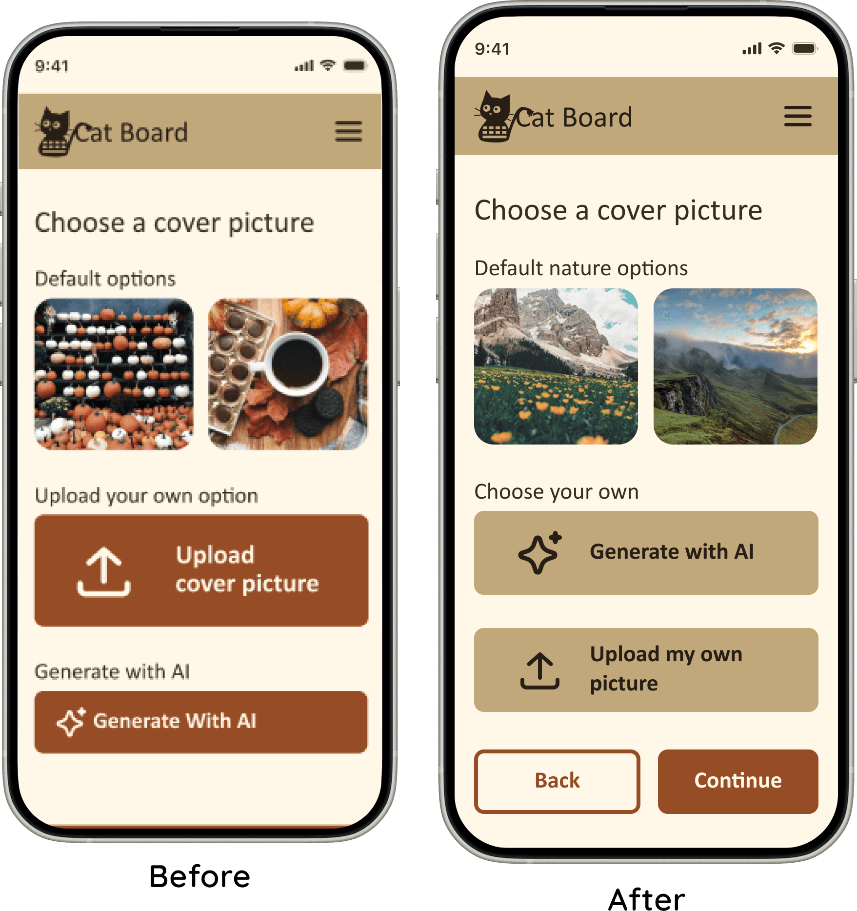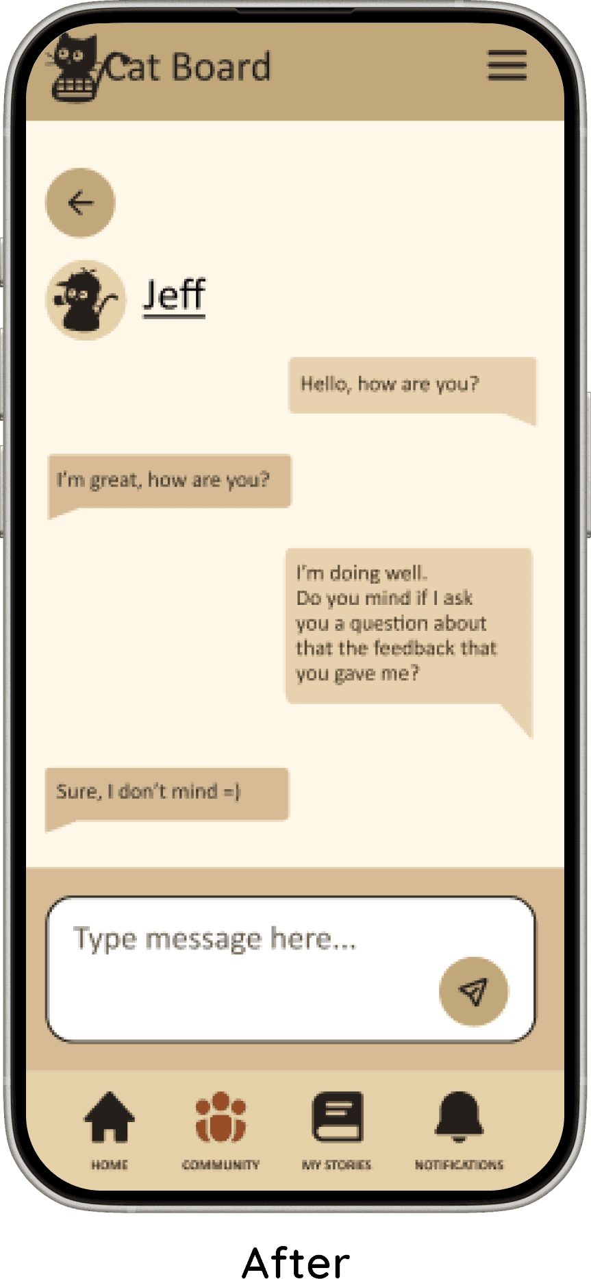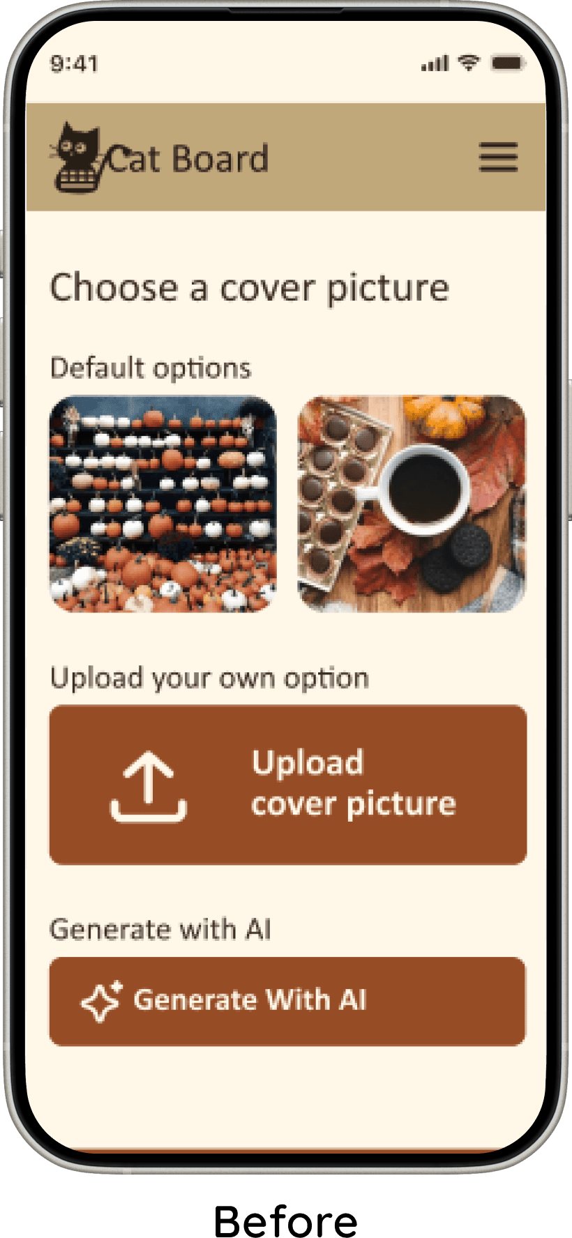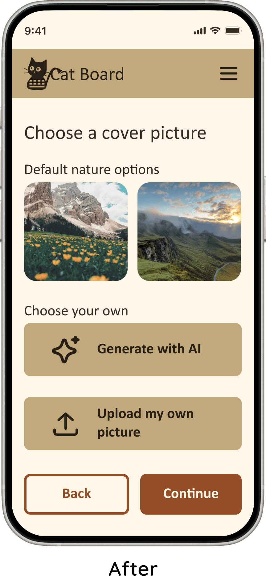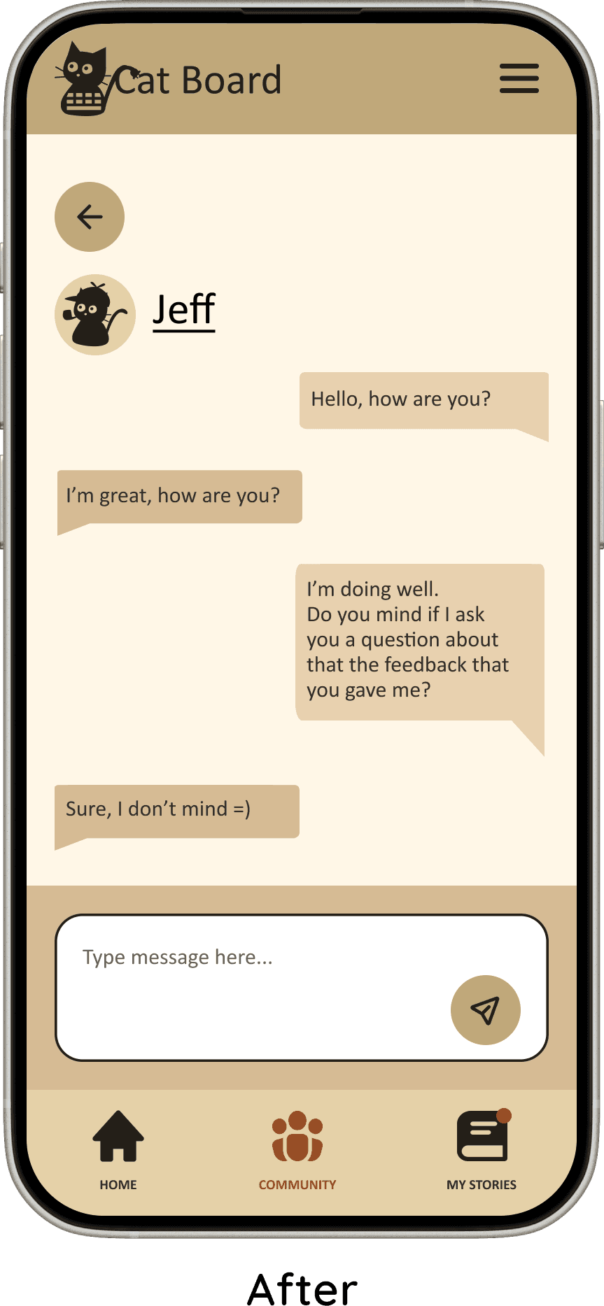 Cat Board is designed with a warm, approachable personality intended to feel inviting and charming to its users. This personality is expressed through thoughtful color choices, visual styling, and a cohesive theme. Typography was selected to balance warmth and approachability with clarity and legibility, ensuring the interface feels welcoming without sacrificing usability.