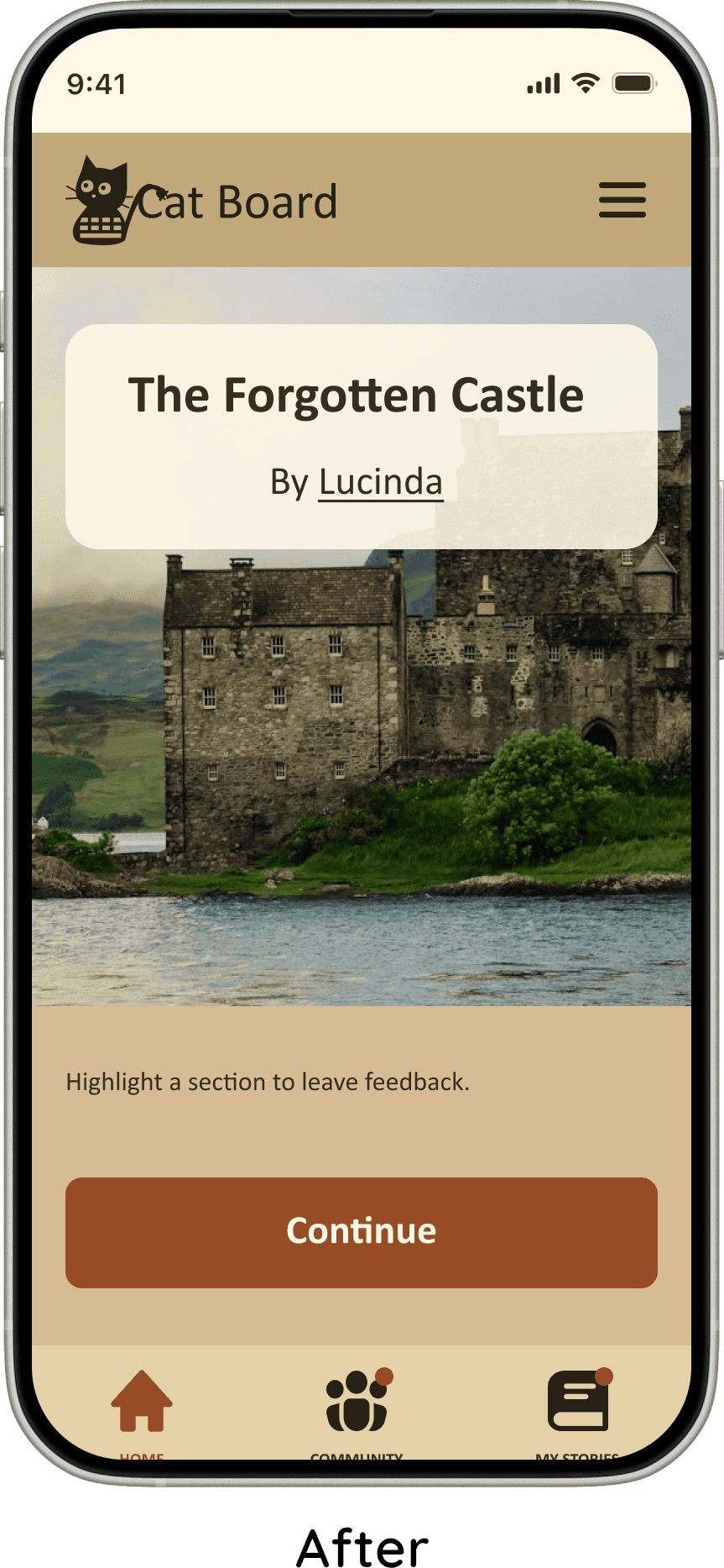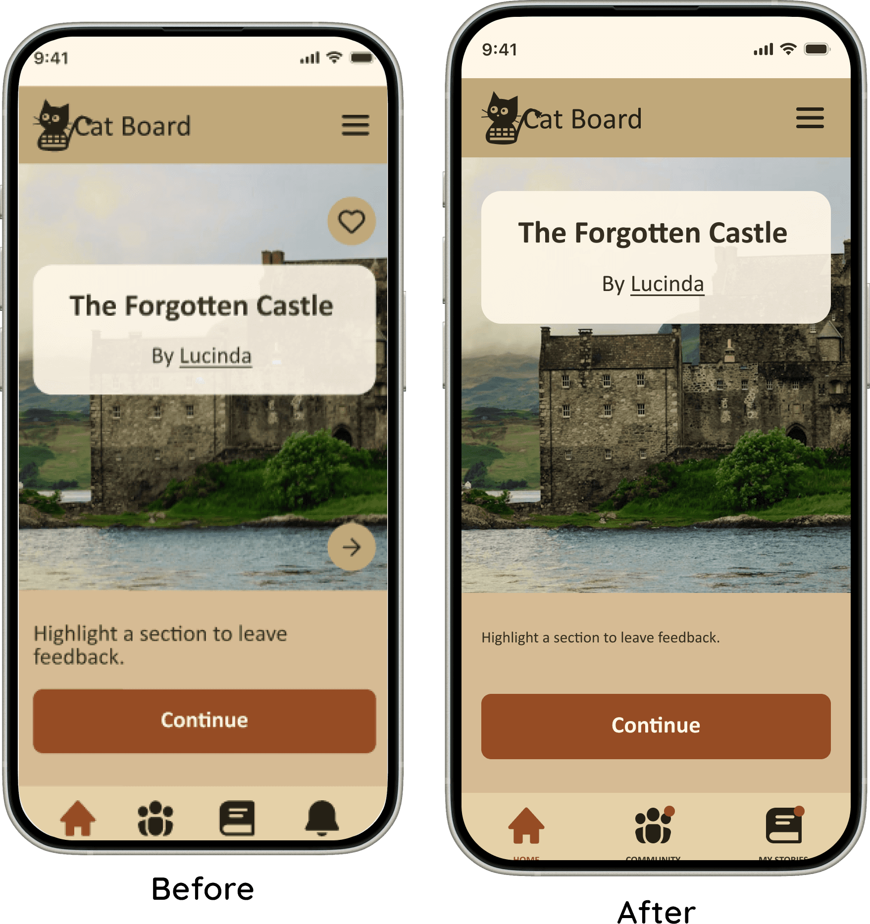 I redesigned the bottom navigation to reduce confusion around messaging. Users were unsure whether to look for messages under Community or Notifications, so I removed the notifications tab entirely and instead added contextual notification badges directly to relevant nav items. Messages from friends now appear on the Community icon, while feedback on stories surfaces on the My Stories icon, making notifications clearer and more intuitive.